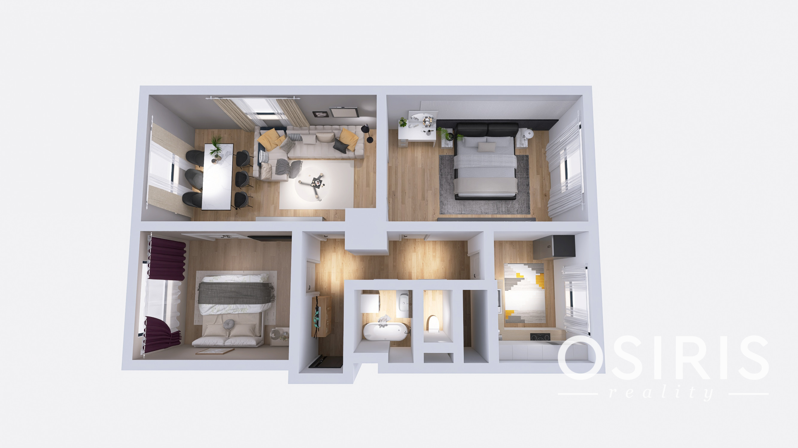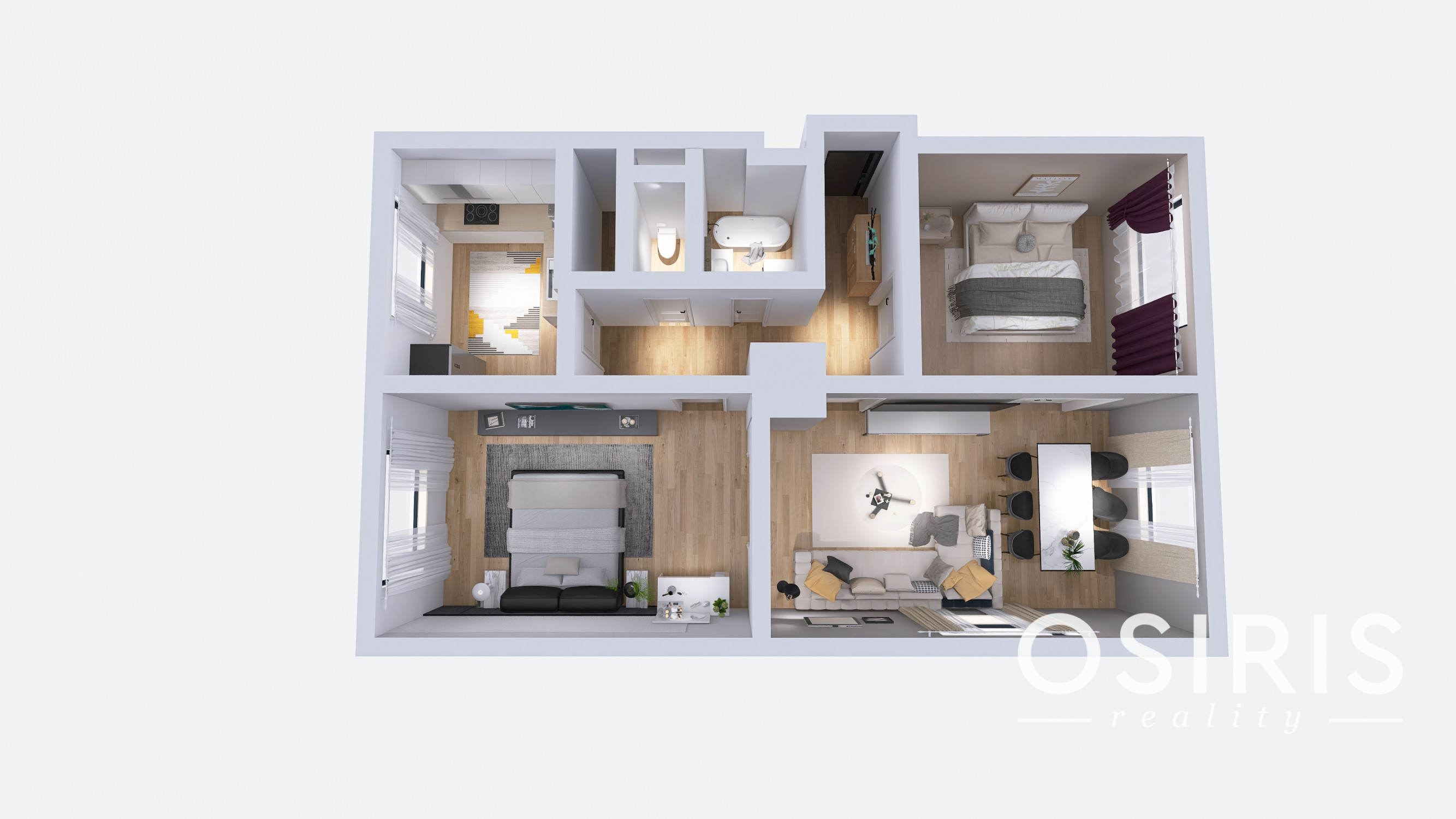 Tri samostatné nepriechodné izby,kuchyňa, kúpeľňa, WC, šatník-sklad.